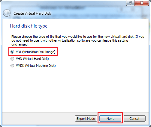 - On the hard disk file type step, select “VDI (VirtualBox Disk Image)” and go forward.